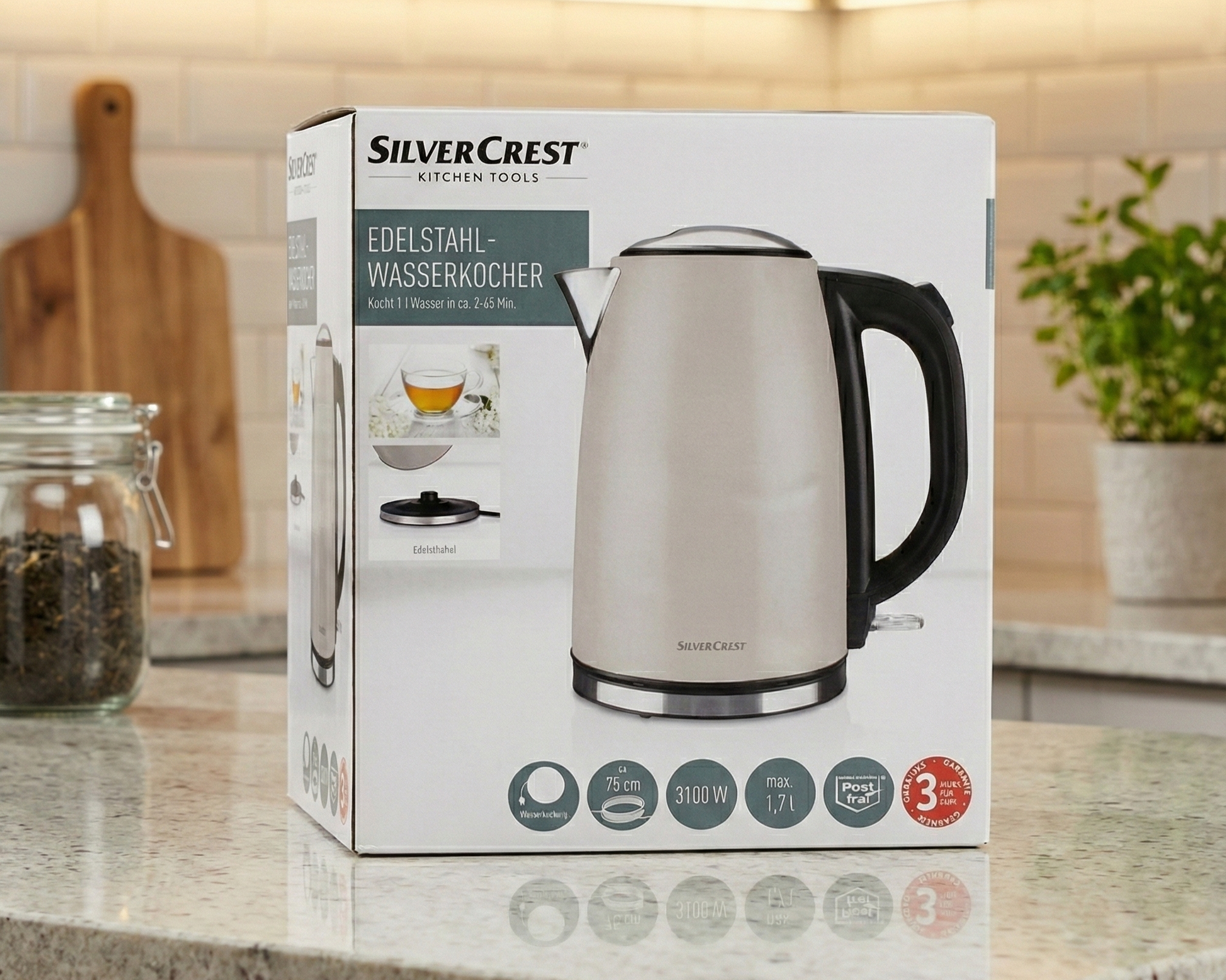 Silvercrest Stainless Steel Kettle (likely model SWKB 3100 A1 or similar). Key features and specifications include: